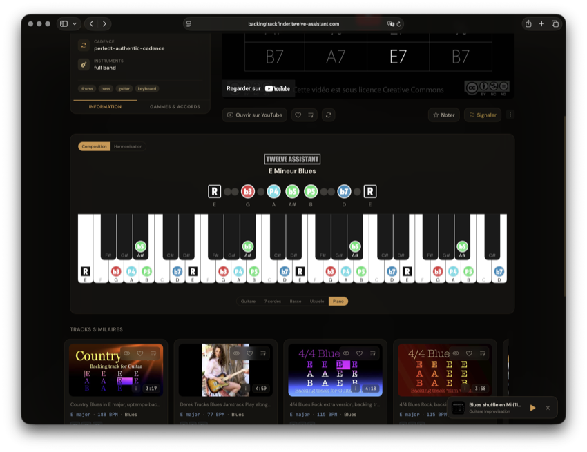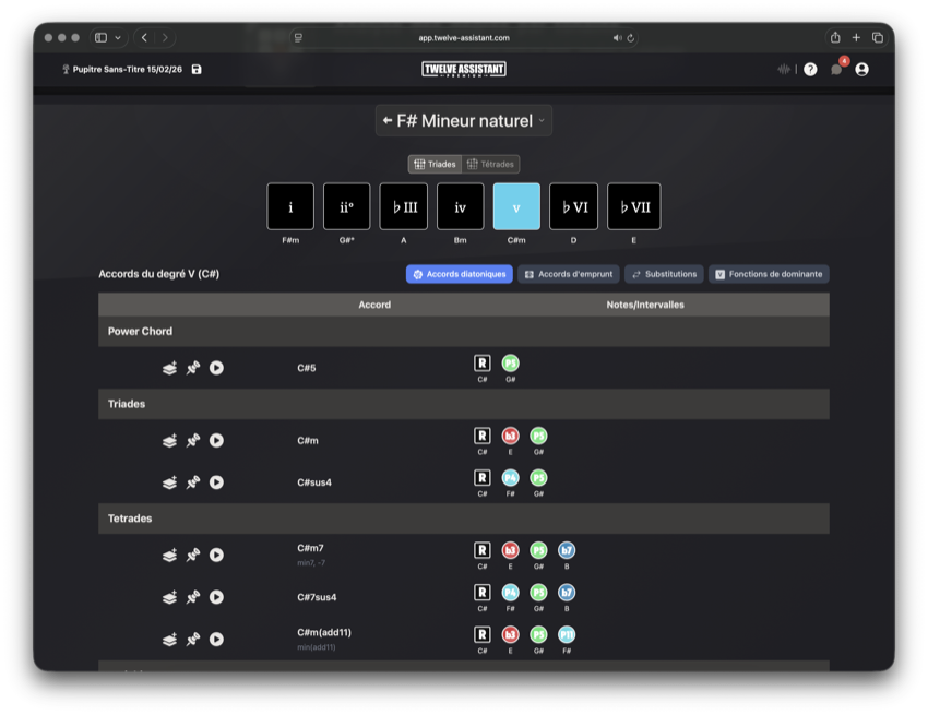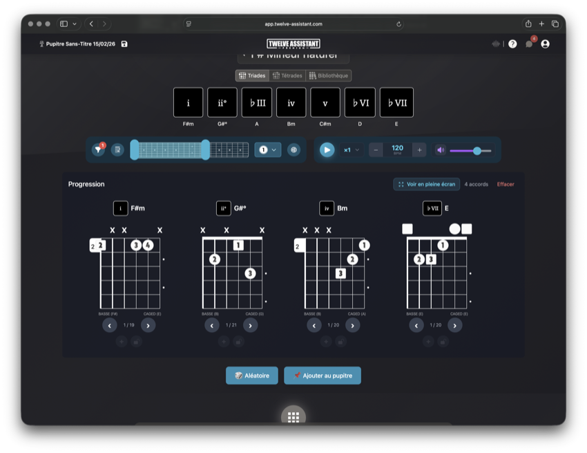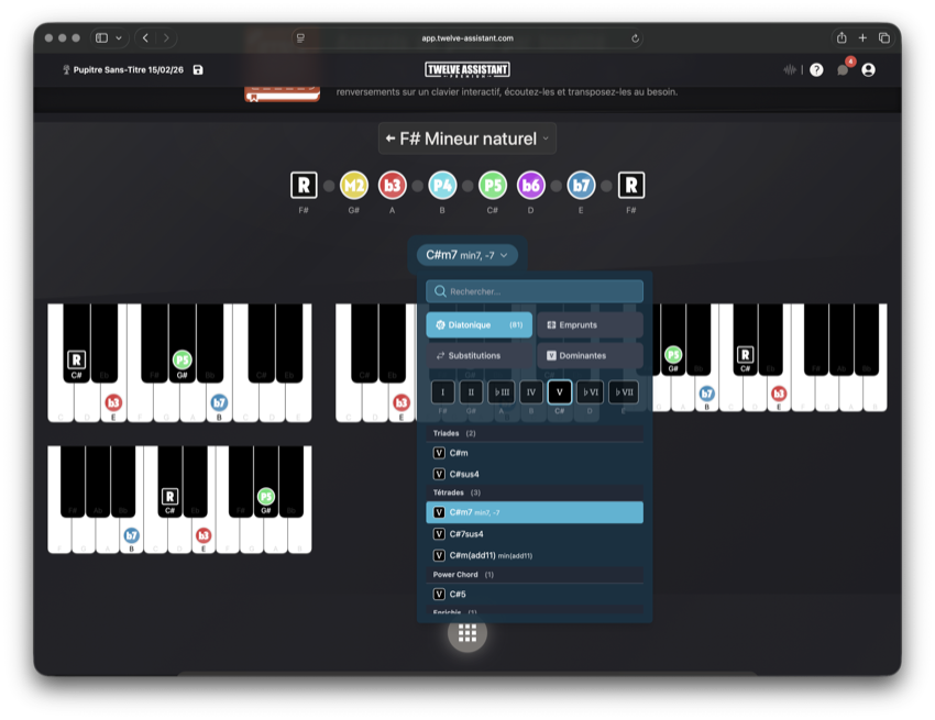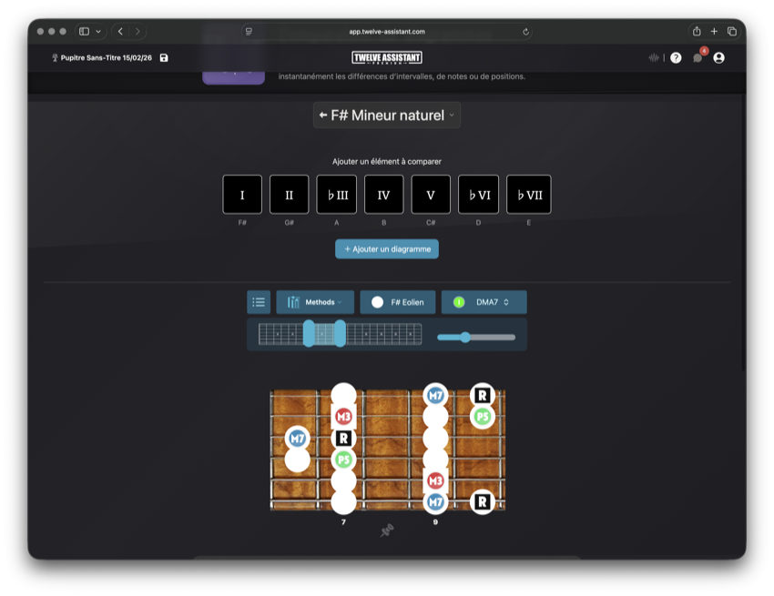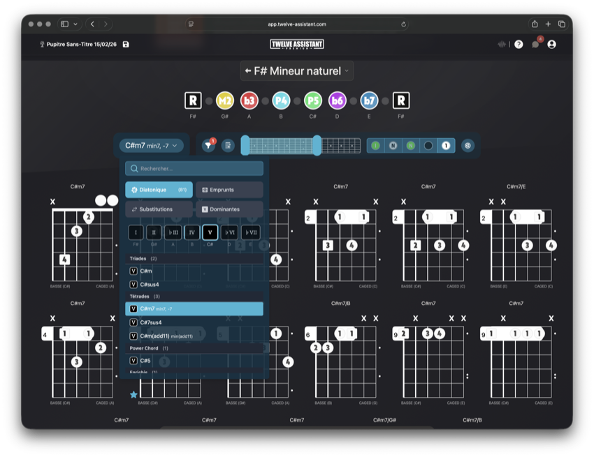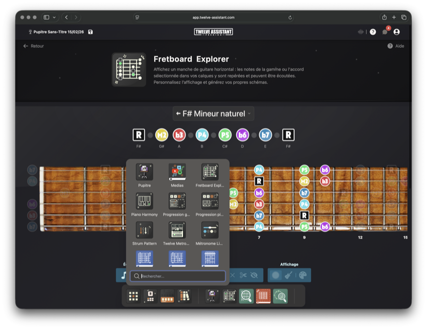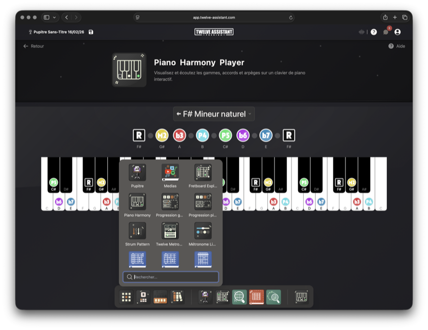 Twelve-Assistant rassemble en une seule application tout ce dont vous avez besoin pour explorer, comprendre et jouer l’harmonie. Cherchez une gamme, visualisez ses degrés sur le manche ou au piano, écoutez les couleurs, empilez accords et diagrammes dans un pupitre prêt à l’emploi… tout se fait vite, clairement, sans perdre votre travail en route.