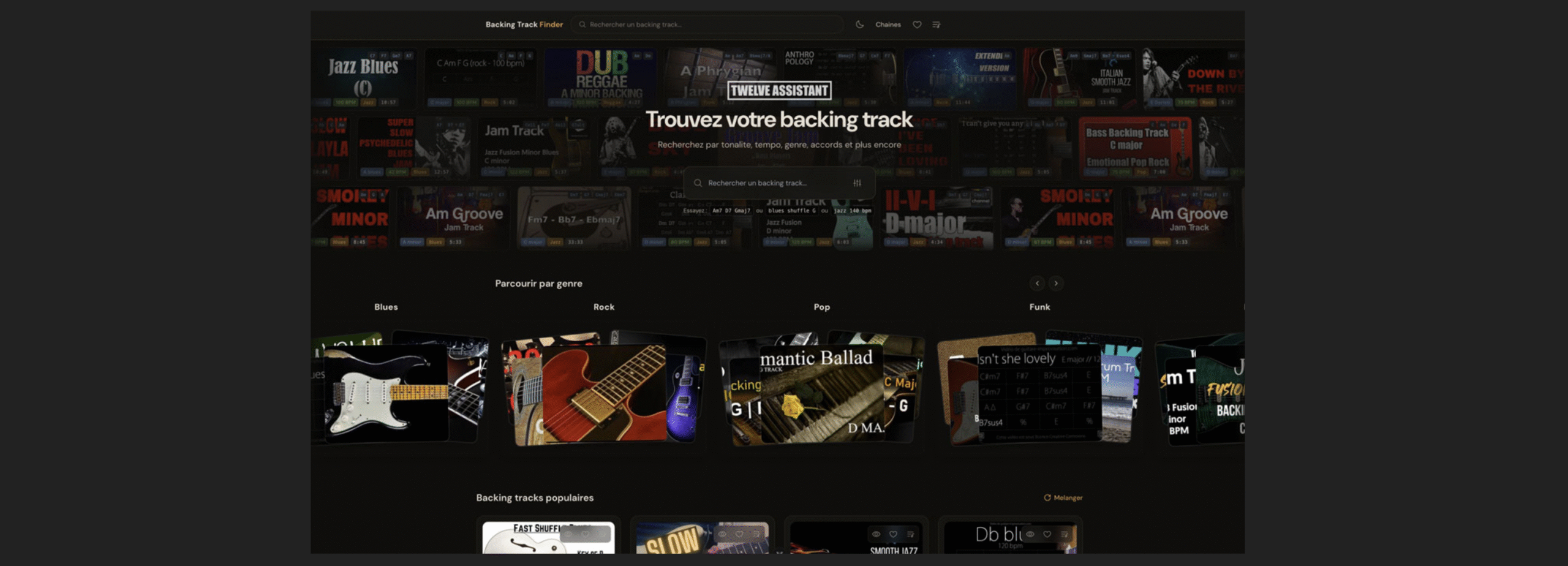C’est un moteur de recherche dédié aux backing tracks avec une différence majeure : il comprend la théorie musicale.